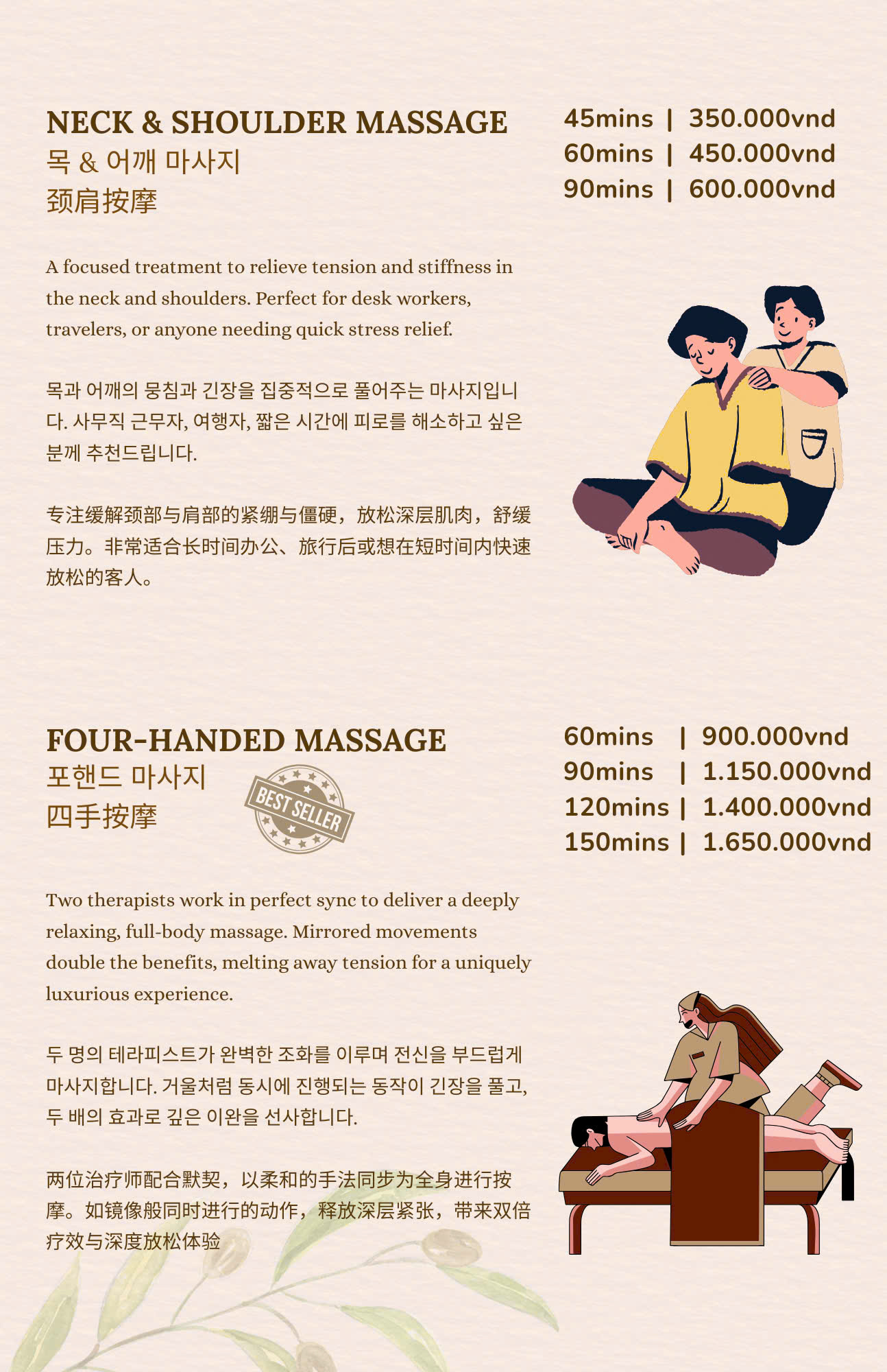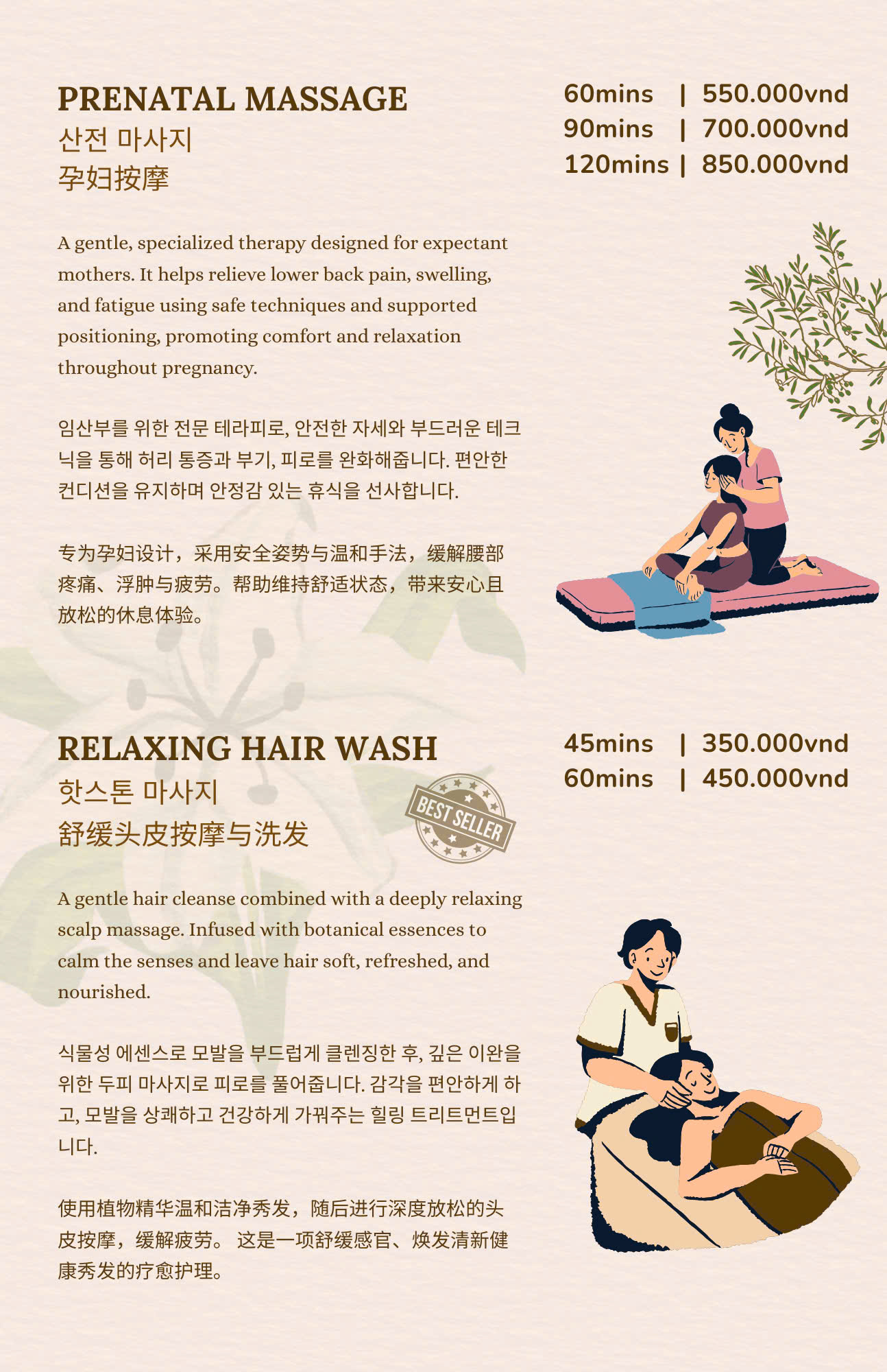 Trải nghiệm massage, chăm sóc móng, chăm sóc da và thư giãn cao cấp. Đặt lịch nhanh chóng chỉ với vài bước đơn giản.
